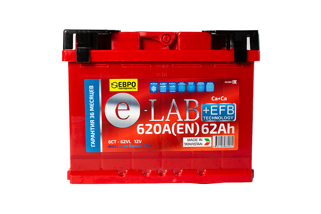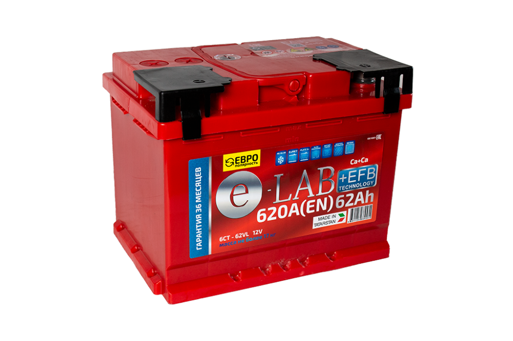 Представленный автомобильный аккумулятор 6СТ-62 «E-LAB + EFB» специально разработан для применения в транспортных средствах с повышенным энергопотреблением или оборудованных системой Start-Stop. В процессе разработки этого изделия, инженеры учли особенности эксплуатации более чем 200 автомобилей и приняли во внимание возможные суровые климатические условия. Это позволило адаптировать продукт к возможным перепадам температур и требованиям производителей автотранспорта. Вся разработка соответствует российскому стандарту ГОСТ Р 53165-2008.