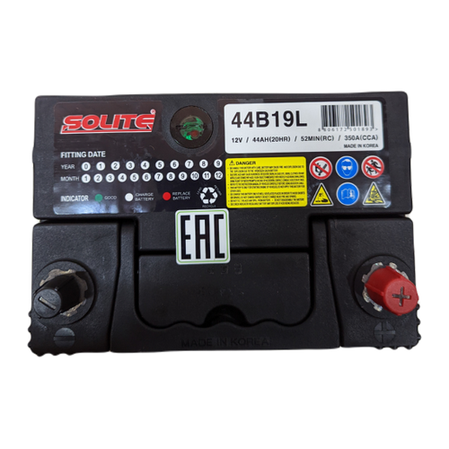 АКБ 44B19L представляет собой кальциевую свинцово-кислотную батарею, произведенную корейским брендом Solite. Эта батарея входит в категорию батарей CMF (Complete Maintenance Free), что означает, что она не требует регулярного обслуживания. В настоящее время свинцово-кислотные батареи остаются лидерами продаж благодаря оптимальному сочетанию цены, качества и эффективности.